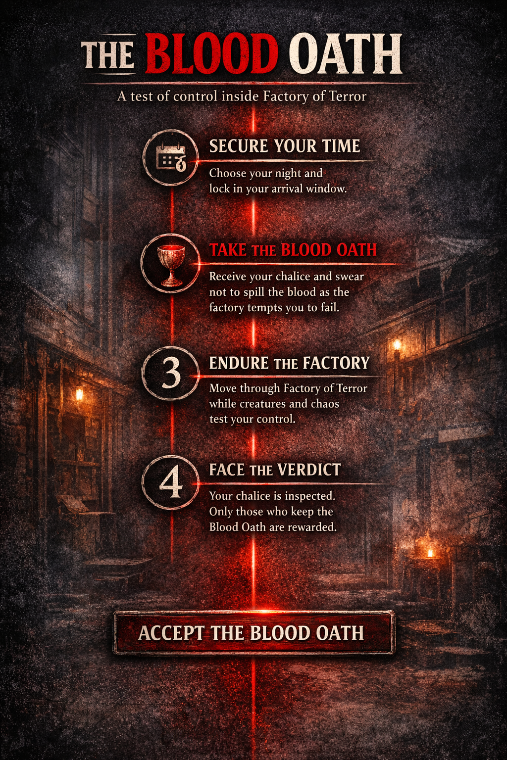 Blood Oath is a special Valentine’s experience at Factory of Terror. Guests are given a chalice filled with blood and sent into the attraction. The factory itself, along with the creatures inside, will do everything they can to test your focus, control, and nerves.